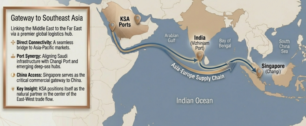 These air links create a seamless bridge between the Middle East and Asia-Pacific markets. When combined with maritime routes through Singapore and emerging Indian infrastructure such as the Vizhinjam deep-sea port, Saudi Arabia strengthens its role in multi-modal, cross-regional supply chains, positioning itself as a natural partner in Asia–Middle East–Europe trade flows.